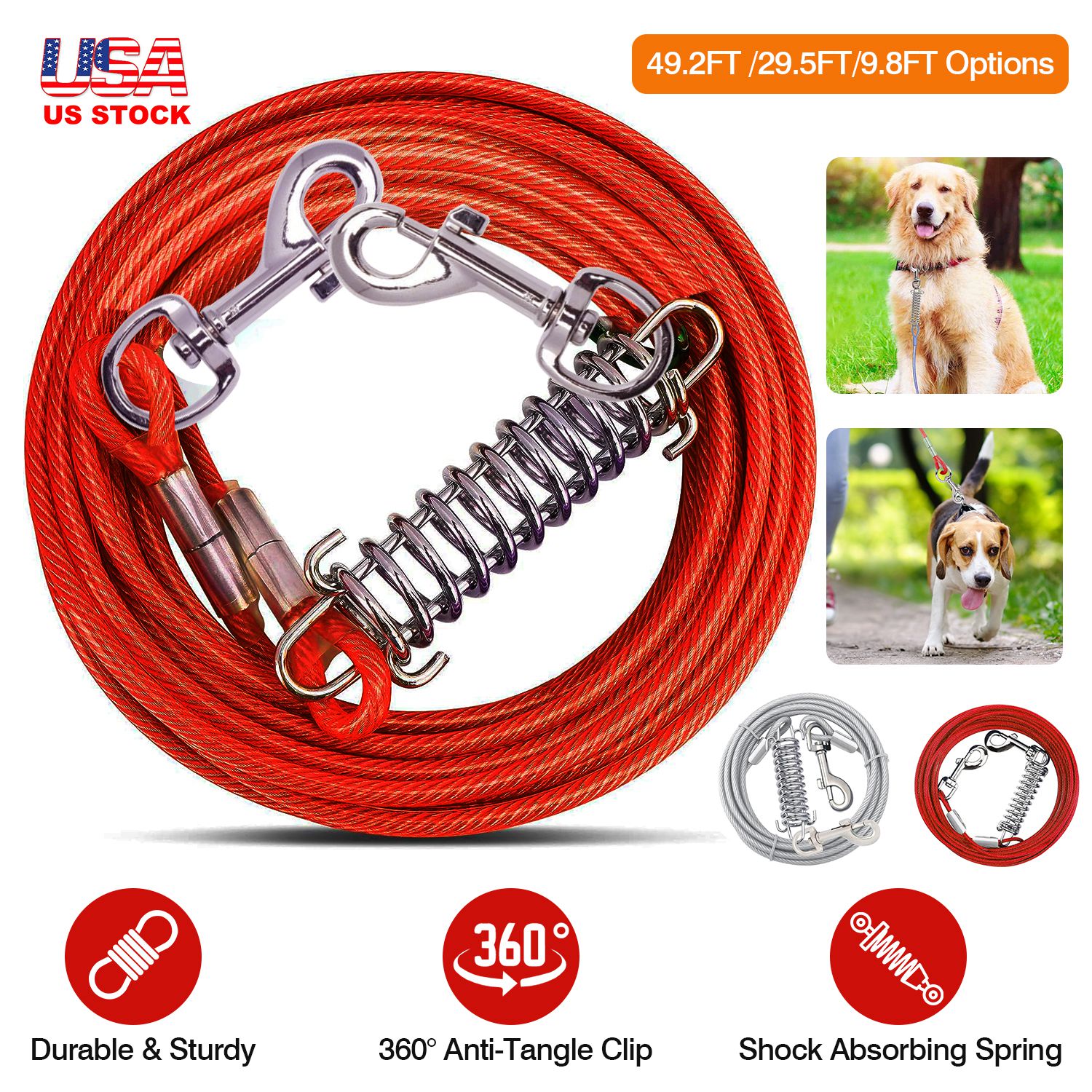Do you want to keep your dog safe while ensure his freedom when traveling outside? This heavy-duty tie out cable with long length is able to limit your dog in a safe area while ensure his freedom at the same time. Buffer spring design can help absorb the shock of swift movement to reduce the neck damage caused by the strong impact force of excitement. 360° Rotatable buckle clips can effectively reduce the tangle of the cable when your dog is moving, protecting your dog's safe. PVC case wrapping around the wire rope makes the cable waterproof, rust-resistant and chew-proof, which can also protect your dog from accidental hurt by the metal scratches. We provide 3 sizes and 2 colors including red and grey, 9.8FT/29.5FT/49.2FT to suit your personal needs.